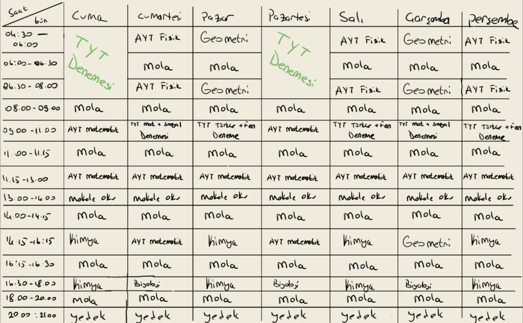 Matematik dersi en lanet derslerden biridir benim gözümde. Her konu çalışmasından sonra tüm soruları doğru yaparken denemelerde nedendir bilinmez 10 soru bile zar zor çözerim. Bu yüzden bu derste dehşet şekilde çalışacağız. En az 3 kitap bitireceğiz. (Buradaki kitap bitirmelerden kastım çalışmanın biteceği kısma kadardır. Örneğin ocak ayında bitti ise her ay bir test kitabı daha ekleyeceğiz.)